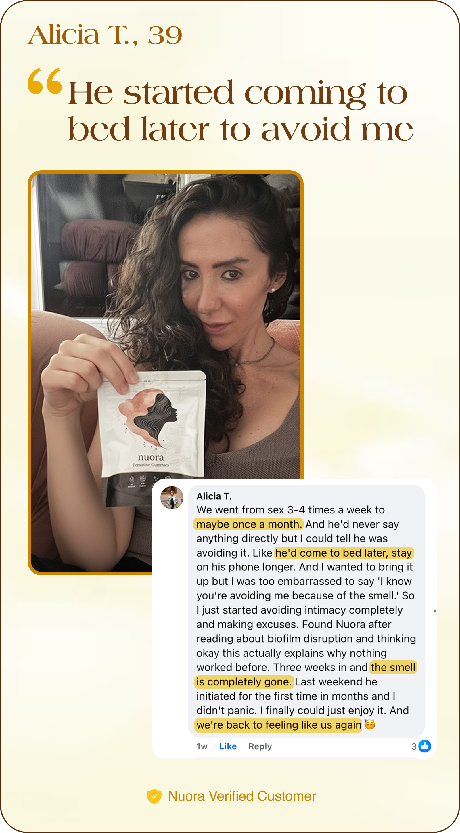 "I love your product, and I have been taking them for months! The freshness is unreal and my confidence is through the roof. Nuora gummies work better than any other feminine health product I've tried, and I've tried them all. The pineapple flavor is actually delicious too!"