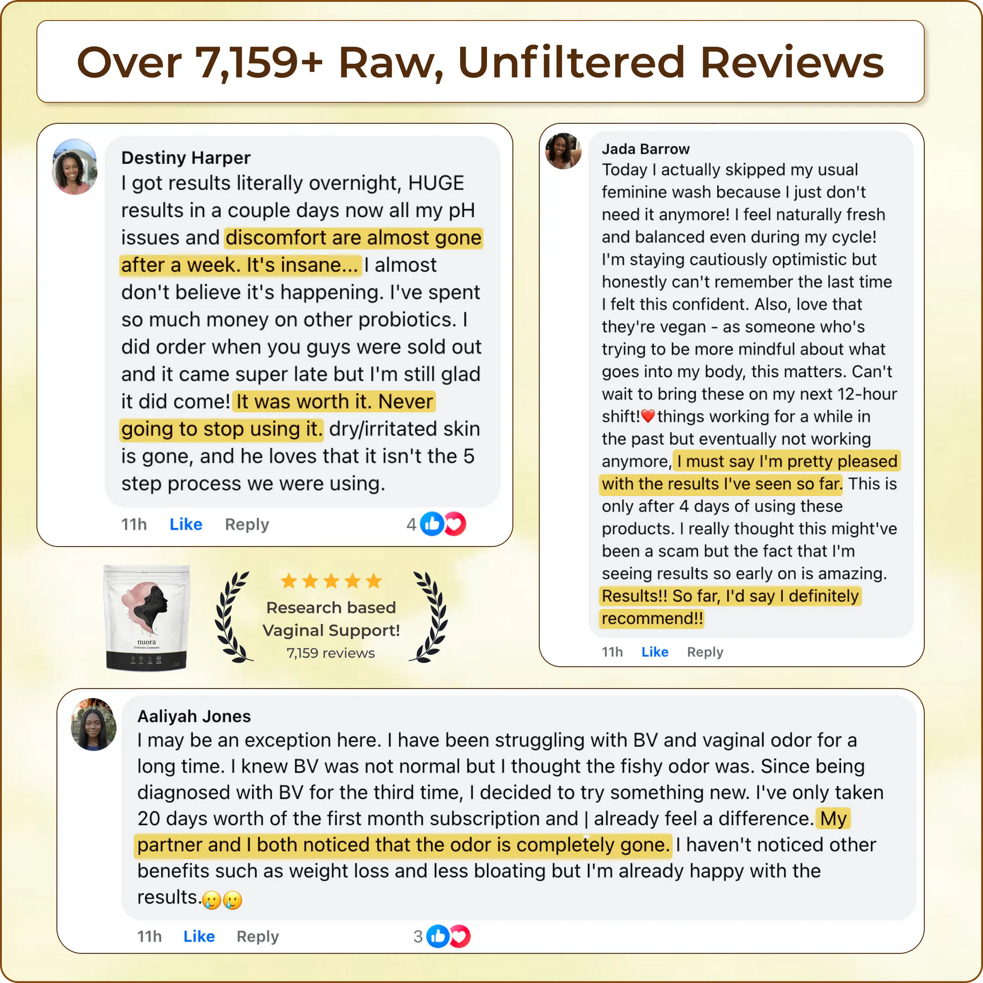 Michelle K. 3 weeks agoVerified CustomerAt 55, age had killed my intimate life. Dryness, odor, zero confidence. Two weeks on these: everything's juicy again, husband keeps asking if I found the fountain of youth!
